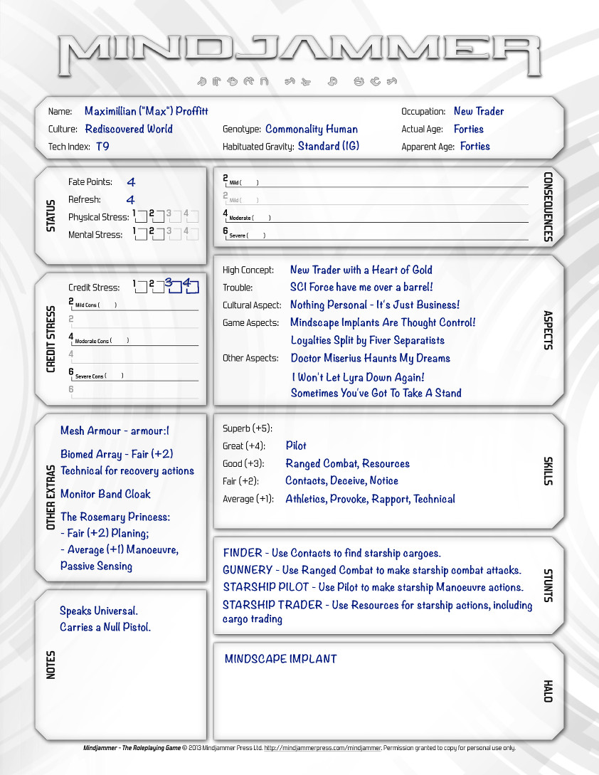 Check out the new character sheet. There’s a lot to note there. First, you’ll be familiar with aspects, skills, and stunts from Fate in general; but look at the two sections Halo and Other Extras. Mindjammer – The Roleplaying Game makes extensive use of Fate Core extras – those additions to characters which can be skills, stunts, aspects, or aggregates of all or some of those, and which represent things external to a character but which nevertheless are parts of a character. At their simplest, extras can be items of equipment – but in Mindjammer we take them a lot further, to have them representing genurgic enhancements, special abilities, vehicles, starships, organisations, cultures, and more. Look at the entry for the Rosemary Princess, Max’s Profit-class new trader starship, which has been impounded by SCI Force since that incident with Doctor Miserius… That’s one of the things we’re doing with extras; in old Mindjammer, you used to need a full “starship sheet” for your starship – in Mindjammer – The Roleplaying Game you can still do that, but you can also have a starship included directly in your character sheet like this, and do all kinds of cool things with it. For example, check out Max’s stunts – Max is a major starship guy, and all of his stunts let him use his own skills in very special ways instead of his starship having to have those skills. Most people with the Ranged Combat skill can just shoot guns; Max, with the “Gunnery” stunt, can use his Ranged Combat skill to attack starships with no penalties for differences in size, representing the fact that he’s the pilot of the Rosemary Princess and also its gunner.