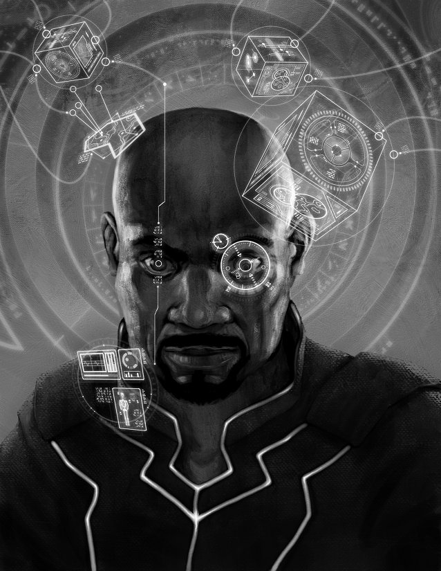 That picture on the right-hand side – by the awesome Jason Juta – is Thaddeus Clay, a culture agent controller from the Security and Cultural Integrity Instrumentality, better known as SCI Force. The ghost images around his head represent his virtual vision – his view into the Mindscape, the vast interstellar shared information storage and communications medium, provided by his Mindscape implant. As a SCI Force controller, Clay isn’t just able to communicate his thoughts to others, to upload and download memories and sensory impressions – known as thoughtcasts – to the Mindscape, but he’s also able to interact directly with other people’s implants, sometimes even reading surface thoughts, making suggestions, and investigating their contacts, actions, and even what enhancements and abilities they have – a phenomenon known as technopsi. He’s wearing a p-suit – a suit of intelligent adaptive weave armour, with a built-in bio-med array and personal sensor suite – with a collar in the shape of the SCI Force insignia.