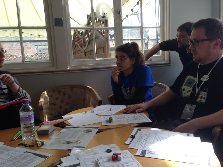 Doctor Mike and I joined Cat Tobin and David Elliot-Mumford (Ornithocracy) that evening in the bar, hosted by Conpulsion Coordinator Euan Reid, for the “great debate” – is the GM dead? A huge crashing clash of opinions – are the “new” brand of GM-less games going to destroy the role of game master in roleplaying games, or will the game master win out? Of course, the real answer to that is a lot more nuanced, but Doctor Mike and I joined forces to doggedly argue that the GM was *doomed* DOOMED!, and that GM-less games were the way ahead. Despite not actually believing that, I think we made a good case – especially for games where all the players are actually GMs in their own rights, too – and I used a lot of my Fate smarts to argue for a more decentralised approach to narration which hit the right spot more than once. It was fun to be basically arguing devil’s advocate all evening, but ultimately I think our true allegiance may have shown… The GM lives! πŸ˜‰