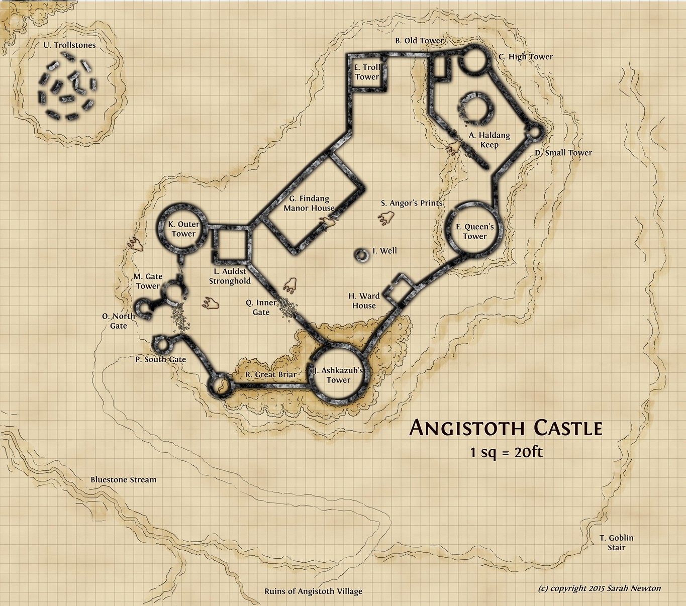 I may show some detail of the ruins of Angistoth village (the bit outside the walls, whose inhabitants fled to form Trollbridge–see last week!), although to be honest I’m not sure how much of the village really is left, and how meaningful it is to show–it was fifty years ago, the buildings were mostly wood or half-timber, and the whole place was stomped on and burned by Angor pretty thoroughly. It may just be worth stripping out the bottom of the map and focussing on the castle and Trollstones. We’ll see!