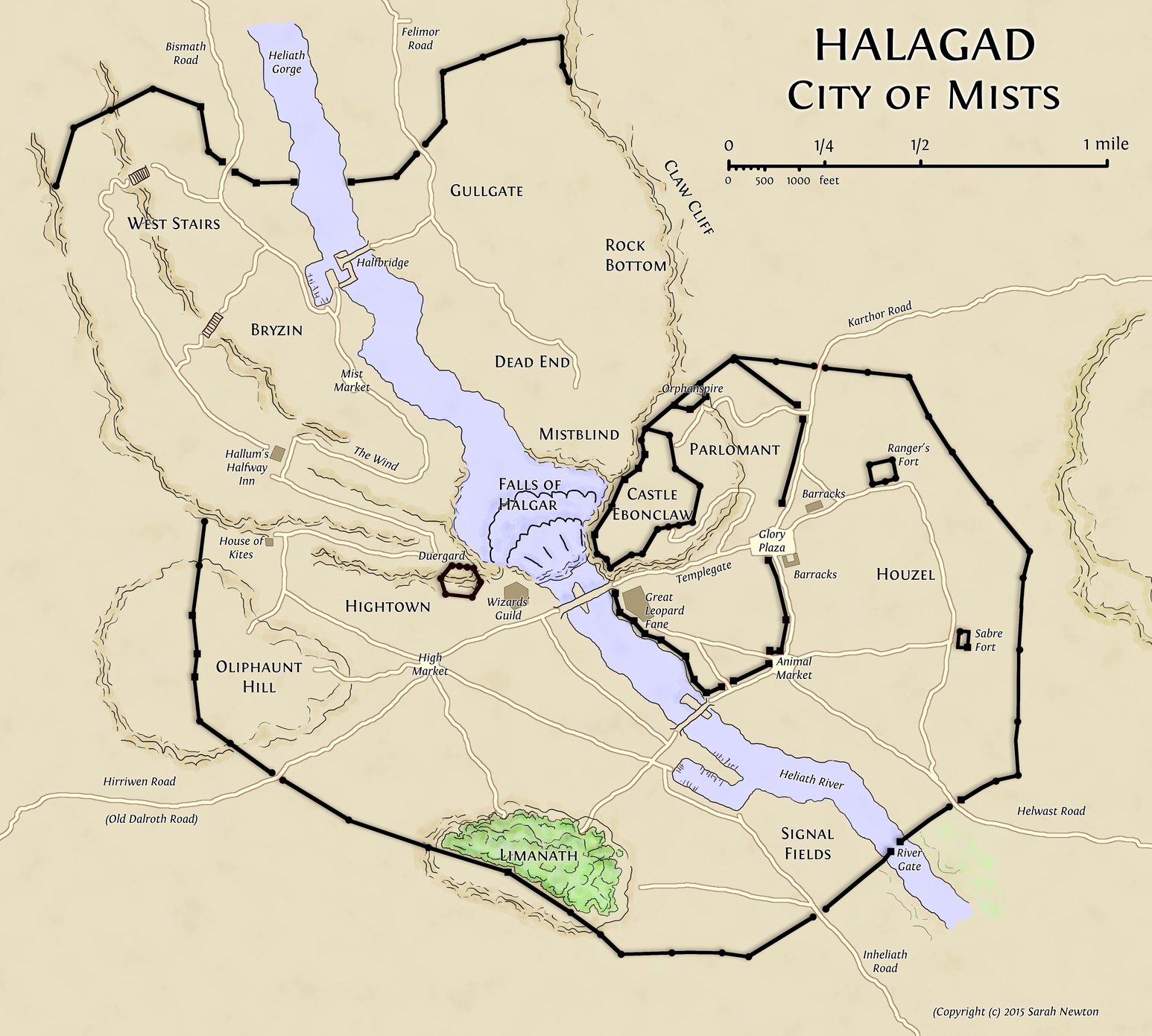 Obviously again this is a work-in-progress – in fact it’s my very first rough map of the city. But I hope you’ll think too that it’s got the makings of a great city for adventuring. First, note that whacking great waterfall right in the heart of the city. The Falls of Halgar bisect Halagad, with the “old city” around the castle, Parlomant, and Templegate, together with Oliphaunt Hill, Houzel, and elven Limanath being above the falls, and Bryzin and the West Stairs (with their hobb holes), Dead-end and Gullgate being below the cliffs in the gorge of the Heliath river, below the falls. Right on the divide, running alongside the falls, is “the Wind”, a winding street used by porters and traders moving cargoes from the docks above and below the falls, transporting goods to and from the elven lands of Inheliath in the south, and up the gorge past Bismath and Felimor and out into the Lake of Mists and to the Salaman heartland and the great Darshi river far to the north.